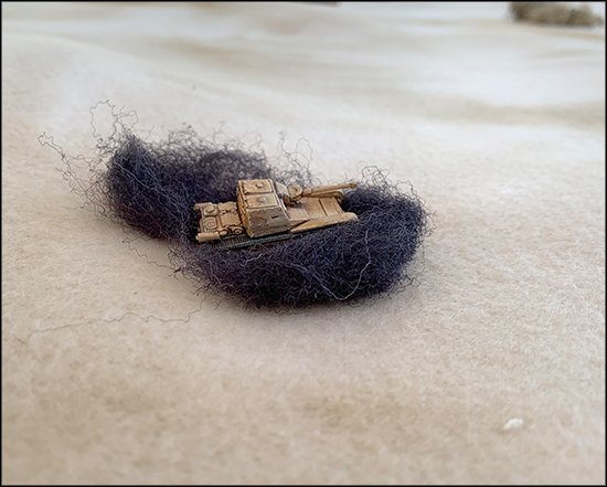 I searched various Army surplus stores for blankets and got a few that worked. Laid over various thicknesses of builder's pinkboard with a bevel cut on the edges, you get a perfectly seamless tabletop on which to place the rest of your terrain. Army blankets, however, have their limitations. Size is the big one. Trying to stretch a blanket made for a standard army cot over a 6' x 8' table is an exercise in dismay. Enter felt.